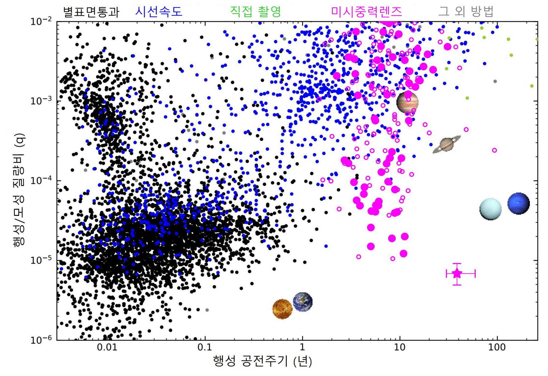 그림 1. 2023년 7월 30일까지 발견된 외계행성 약 5천여 개에 대한 행성 공전주기에 따른 행성/모성 질량비(q) 분포. 검은색, 청색, 녹색 점은 각각 별표면통과(Transit), 시선속도(Radial Velocity), 직접촬영(Imaging) 방법에 의해 발견된 외계행성을 가리킨다. 자주색 점은 KMTNet이 미시중력렌즈(Microlensing) 방법으로 발견한 외계행성이며, 자주색 빈 원은 KMTNet 이외의 연구팀이 미시중력렌즈 방법으로 발견한 외계행성을 의미한다. 회색 점은 그 외 방법으로 발견된 외계행성이다. 그래프 내 자주색 별은 이번 연구에서 발견한 장주기 슈퍼지구 외계행성 ‘OGLE-2016-BLG-0007Lb’의 위치를 나타낸다.