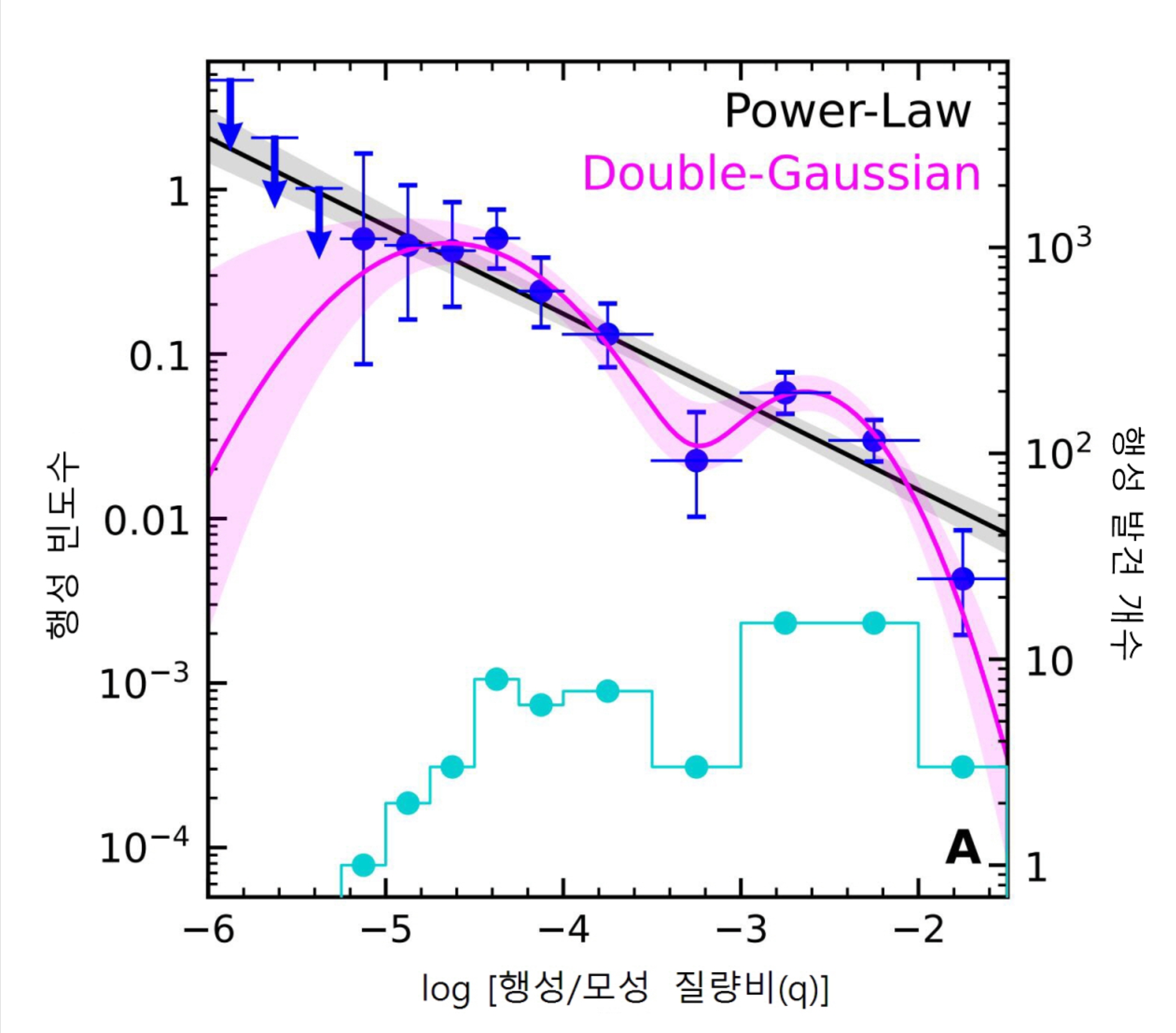 그림 2. 행성/모성 질량비(q)에 따른 행성의 빈도수 분포. 녹색 히스토그램은 KMTNet에 의해 발견된 외계행성 개수 분포를 나타내며, 파란색 분포는 KMTNet 외계행성을 기반으로 예측한 장주기 외계행성의 빈도수 분포이다. 파란색 분포가 쌍봉 분포를 이루고 있음을 확인할 수 있다. 검은색(멱함수) 및 자주색(이중-가우시안 함수) 곡선은 파란색 분포를 설명하기 위한 빈도수 모델이며, 최적 모델은 자주색 곡선이다.