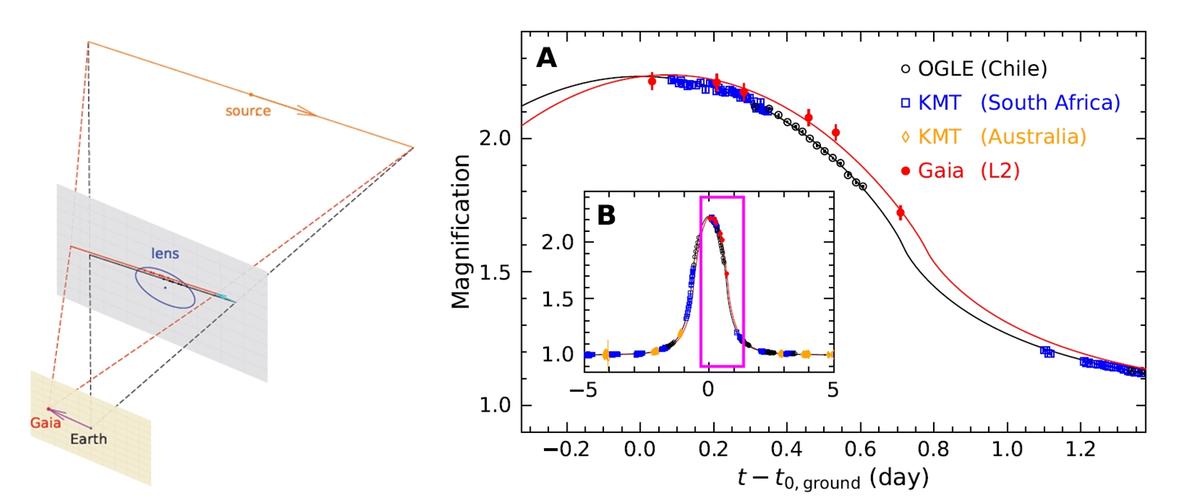 그림 2. (왼쪽) 지상과 가이아 우주망원경이 관측한 미시중력렌즈 3차원 개략도 (오른쪽) KMT-2024-BLG-0792/OGLE-2024-BLG-0516 미시중력렌즈 사건의 광도 곡선. (A 지상망원경과 가이아 우주망원경이 공동 관측한 광도 곡선 모습. B 미시 중력렌즈 사건의 전체 모습)
