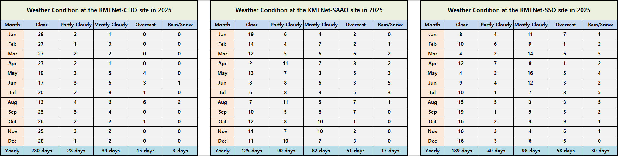 KMTNet 남반구 3개 관측소의 2025년 월별 기상상태를 표로 정리하였다.