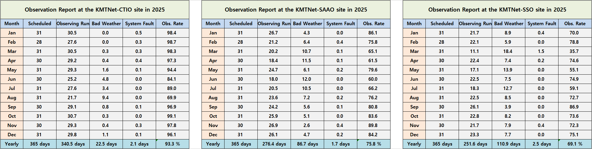KMTNet 남반구 3개 관측소의 2025년 월별 관측현황을 표로 정리하였다. 칠레 관측소에서는 340.5일을 관측하여 93.3%의 관측률을 나타났으며, 날씨 불량은 22.5일, 기기고장은 2.1일이었다. 남아공과 호주 관측소에서는 각각 75.8%, 69.1%의 관측률을 보였다.