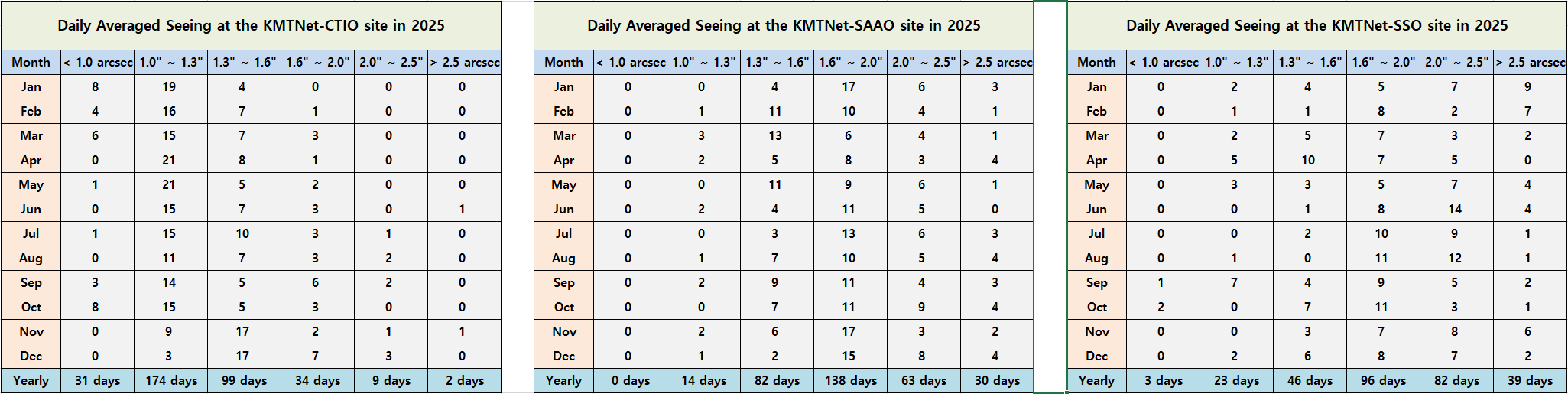 KMTNet 남반구 3개 관측소의 2024년 월별 시상자료를 표로 정리하였다. 시상은 KMTNet CCD 카메라 영상에 찍힌 별을 이용하여 얻었으며, 하룻밤의 시상자료를 평균한 통계이다.