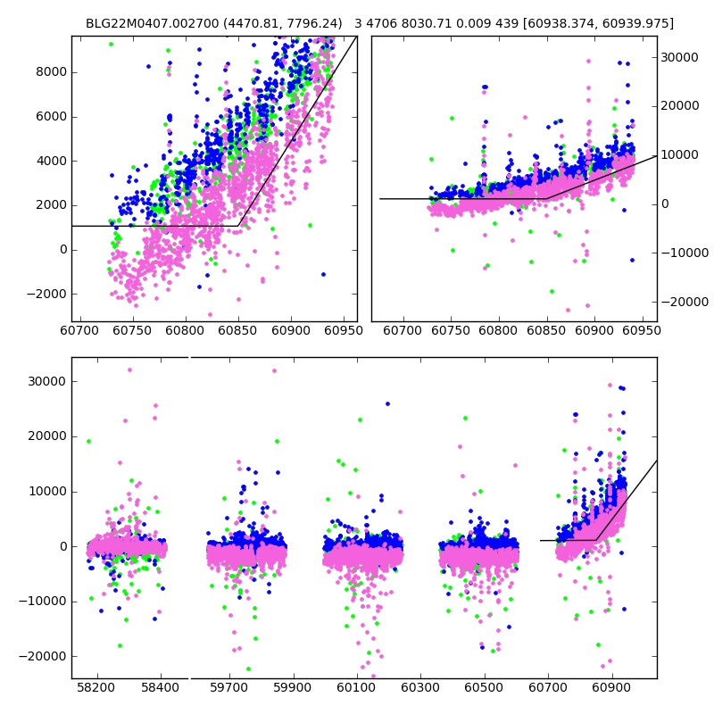 ● CTIO ● SAAO ● SSO ● Largest local dchi2 value (same as site of EVENT name) ● Local dchi2 is less than 0.05 times global dchi2 KMTA22_I.diapl KMTC22_I.diapl KMTS22_I.diapl gzipped tar file for all DIA data | |
