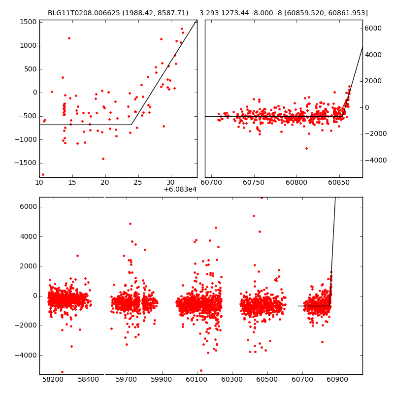 ● CTIO ● SAAO ● SSO ● Largest local dchi2 value (same as site of EVENT name) ● Local dchi2 is less than 0.05 times global dchi2 KMTA11_I.diapl KMTC11_I.diapl KMTS11_I.diapl gzipped tar file for all DIA data | |