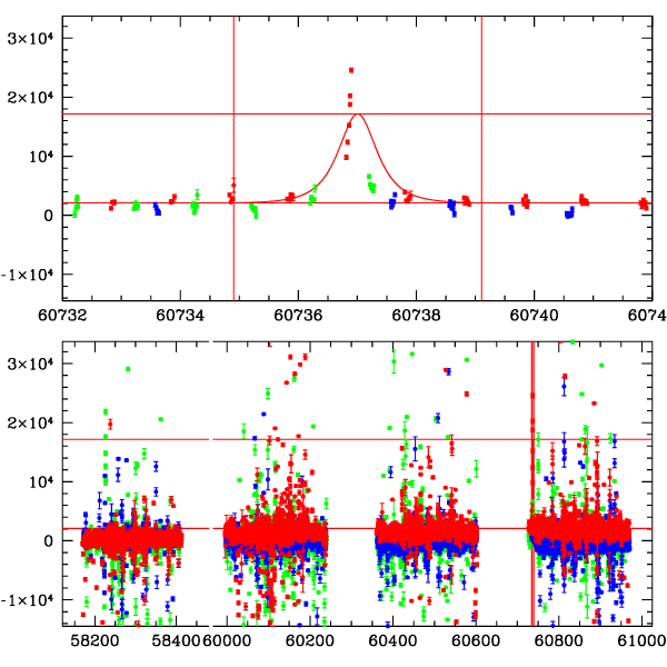 ● CTIO ● SAAO ● SSO ● Largest local dchi2 value (same as site of EVENT name) ● Local dchi2 is less than 0.05 times global dchi2 KMTA43_I.diapl KMTC43_I.diapl KMTS43_I.diapl gzipped tar file for all DIA data | |