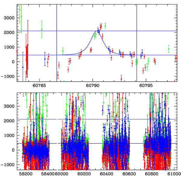 ● CTIO ● SAAO ● SSO ● Largest local dchi2 value (same as site of EVENT name) ● Local dchi2 is less than 0.05 times global dchi2 KMTA31_I.diapl KMTC31_I.diapl KMTS31_I.diapl gzipped tar file for all DIA data | |