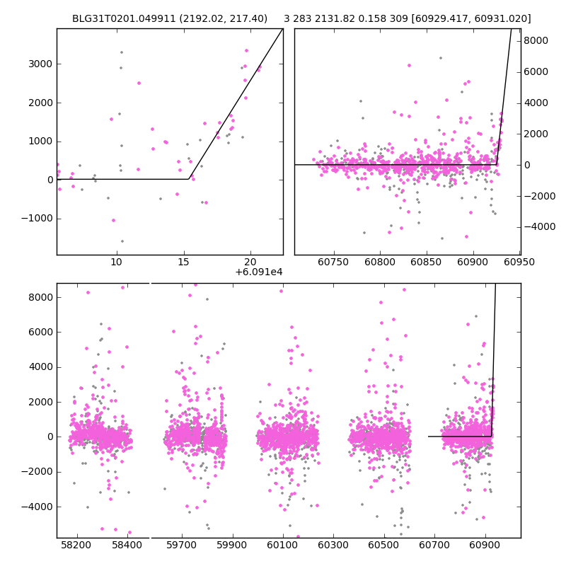 ● CTIO ● SAAO ● SSO ● Largest local dchi2 value (same as site of EVENT name) ● Local dchi2 is less than 0.05 times global dchi2 KMTA31_I.diapl KMTC31_I.diapl KMTS31_I.diapl gzipped tar file for all DIA data | |