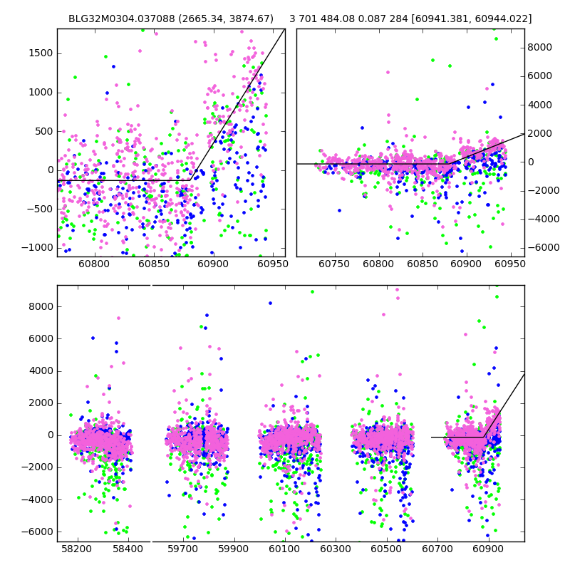 ● CTIO ● SAAO ● SSO ● Largest local dchi2 value (same as site of EVENT name) ● Local dchi2 is less than 0.05 times global dchi2 KMTA32_I.diapl KMTC32_I.diapl KMTS32_I.diapl gzipped tar file for all DIA data | |