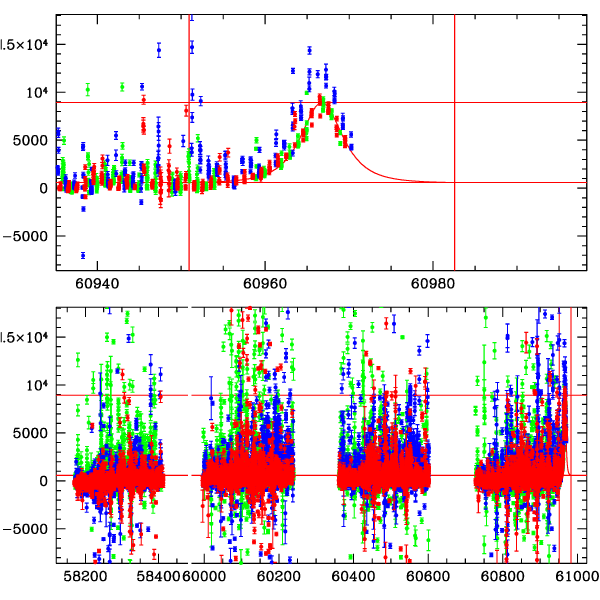 ● CTIO ● SAAO ● SSO ● Largest local dchi2 value (same as site of EVENT name) ● Local dchi2 is less than 0.05 times global dchi2 KMTA43_I.diapl KMTC43_I.diapl KMTS43_I.diapl gzipped tar file for all DIA data | |